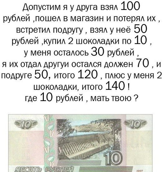 Заставите моск вывихнуть спозаранку. Де десять рублей, де десять рублей... Тоже потерял, оболдуй, с тебя станется.