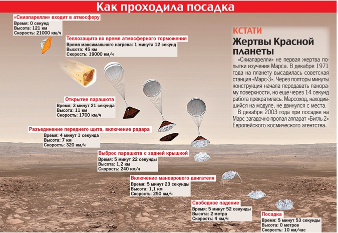"Скиапарелли" не первая жертва попытки изучения Марса. В декабре 1971 года на планету высадилась советская станция "Марс-3". Через полторы минуты конструкция начала передавать панораму поверхности, но еще через 14 секунд работа прекратилась. Марсоход, находившийся на модуле, не двинулся с места.